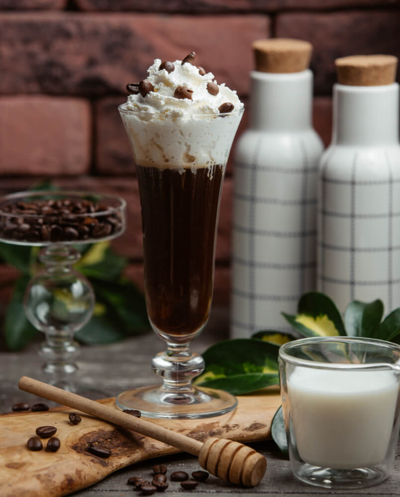Café helado con crema batida y un toque de miel, ideal para refrescarse con sabor intenso y dulce.