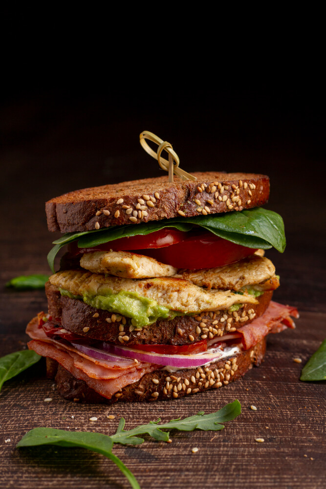 Pan integral con semillas, relleno de pollo a la plancha, aguacate cremoso, tocino crujiente, tomate fresco y cebolla morada.