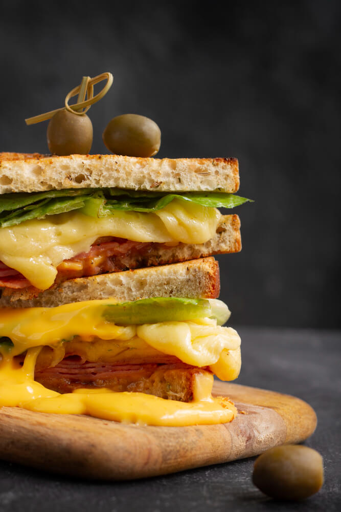 Sándwich de pan tostado con capas de jamón, queso fundido, espinaca fresca y aguacate, coronado con aceitunas.