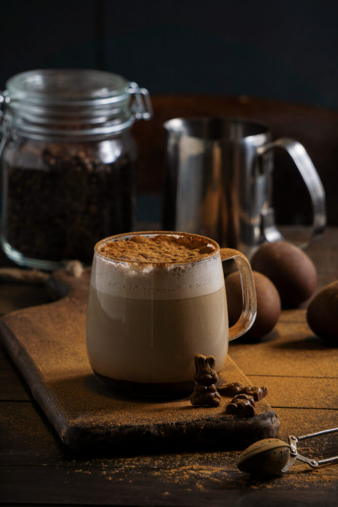 Capuccino espumoso con un toque de canela y cacao, acompañado de pequeños chocolates para disfrutar.