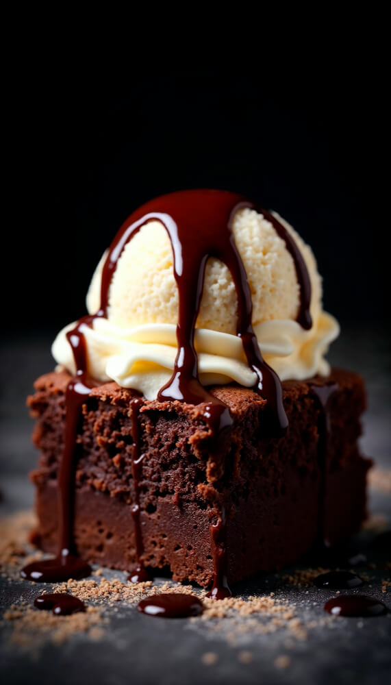 Brownie de chocolate con helado de vainilla, crema batida y salsa de chocolate, un clásico irresistible.