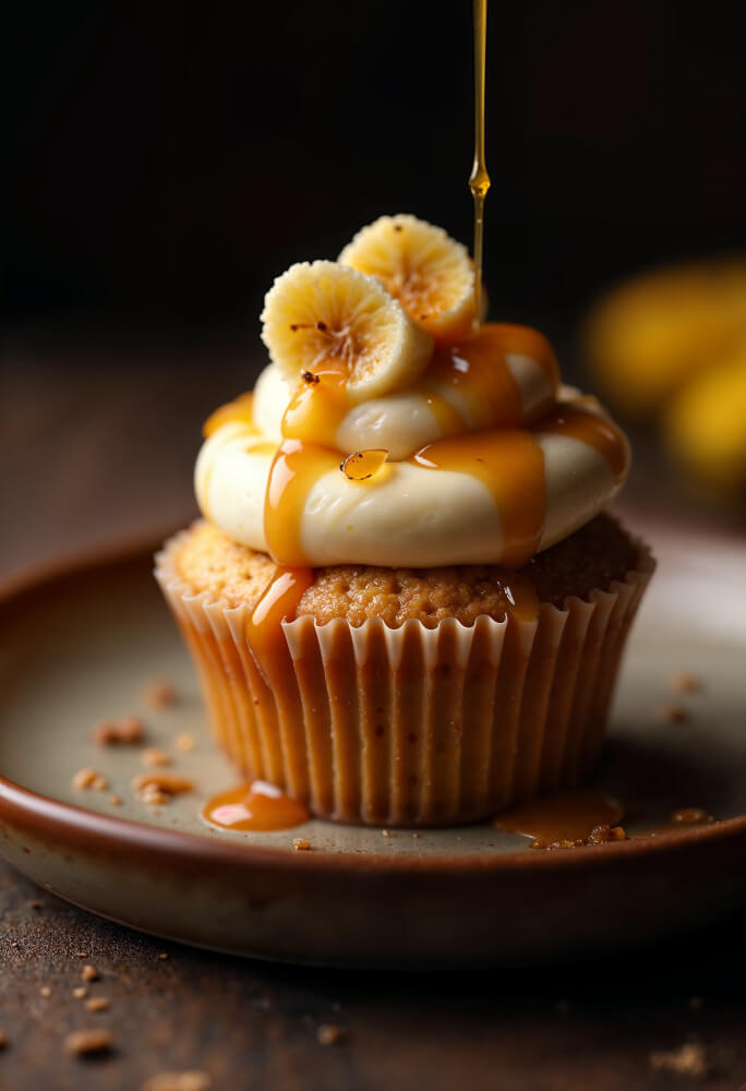 Cupcake de plátano con cobertura cremosa, rodajas frescas y un toque de caramelo, dulce y tentador.