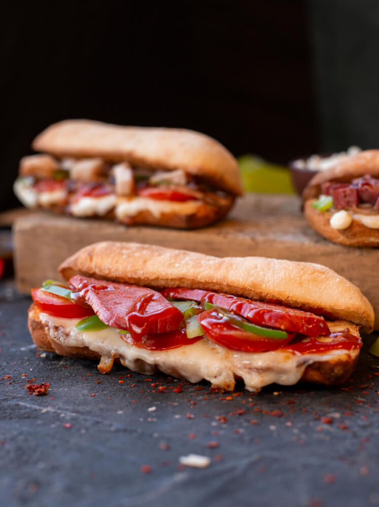 Pan tostado relleno de queso fundido, pepperoni, pimientos verdes y salsa de tomate, servido caliente y crujiente.